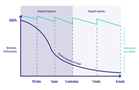Selon la courbe de l'oubli du scientifique allemand Hermann Ebbinghaus, 50 % des apprentissages sont oubliés dans les jours qui suivent, sauf si on les réapprend plusieurs fois. Mémorable se base donc sur la "répétition espacée" pour entraîner la mémoire et ancrer durablement ses connaissances.